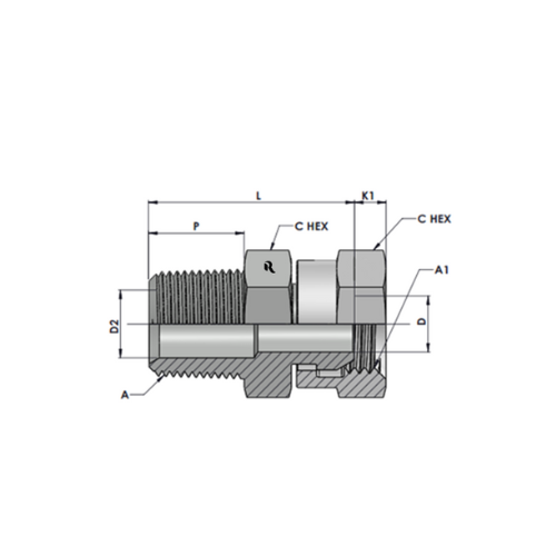 | Tube O.D. | A THREAD | A1 THREAD | C Hex | L Length | P Length | K1 | D DRILL | D2 DRILL | Part Number | Torque N-m | Working pressure in Bar |